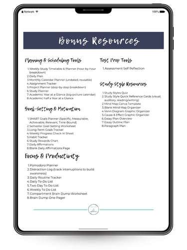 The Study Skills Toolkit will include over 30 ready-to-use digital & printable products--planners, trackers, templates, and organizers--to help you put strategies into action