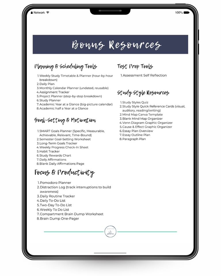 Secure your copy of the Study Skills Toolkit today. You'll get immediate access to the content outline--so you can start applying strategies right away--and automatic delivery of the full designed tollkit with 30+ printables at launch.