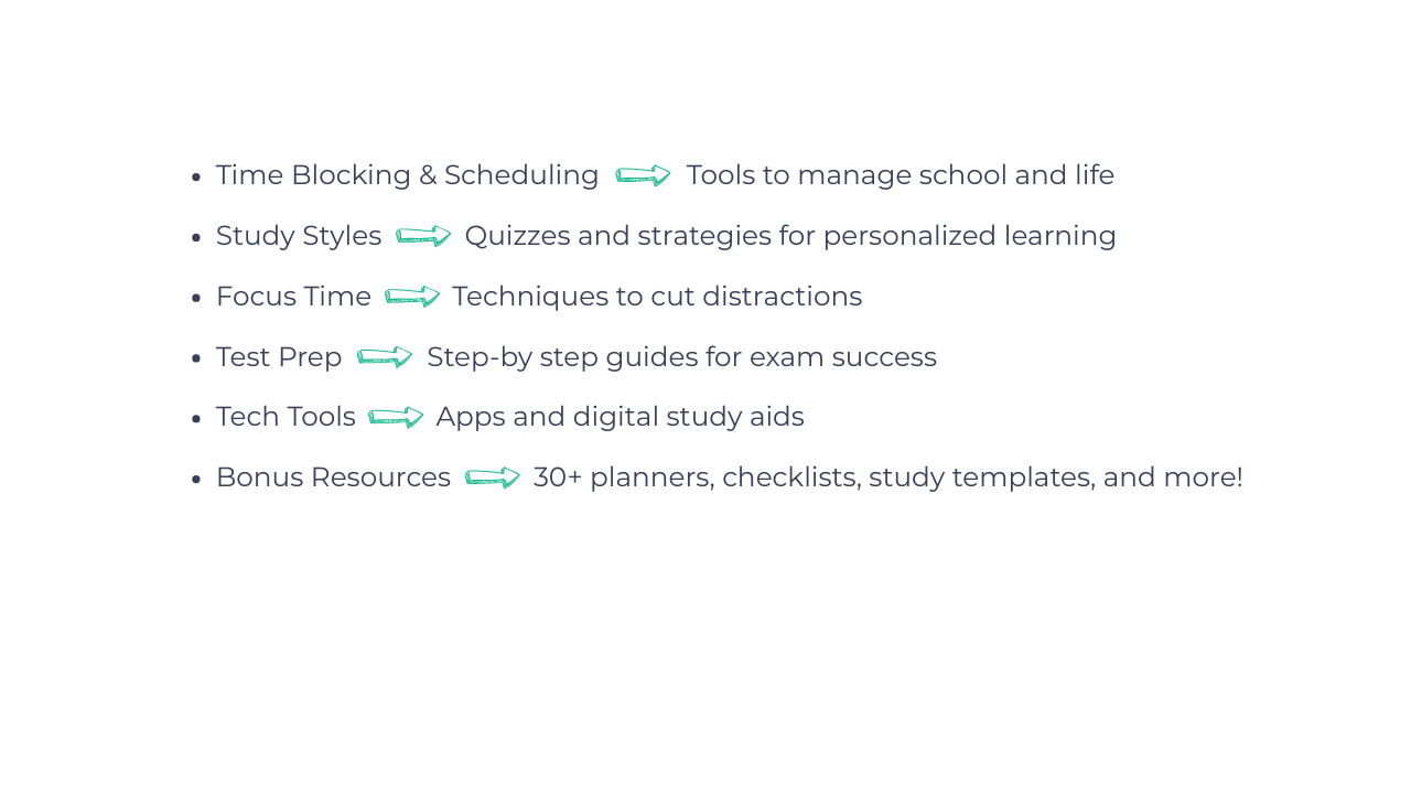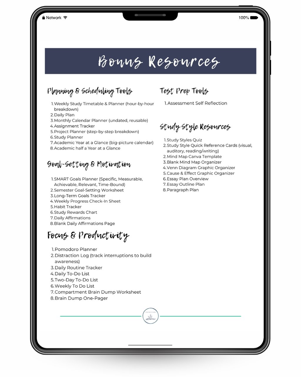 Secure your copy of the Study Skills Toolkit today. You'll get immediate access to the content outline--so you can start applying strategies right away--and automatic delivery of the full designed tollkit with 30+ printables at launch.